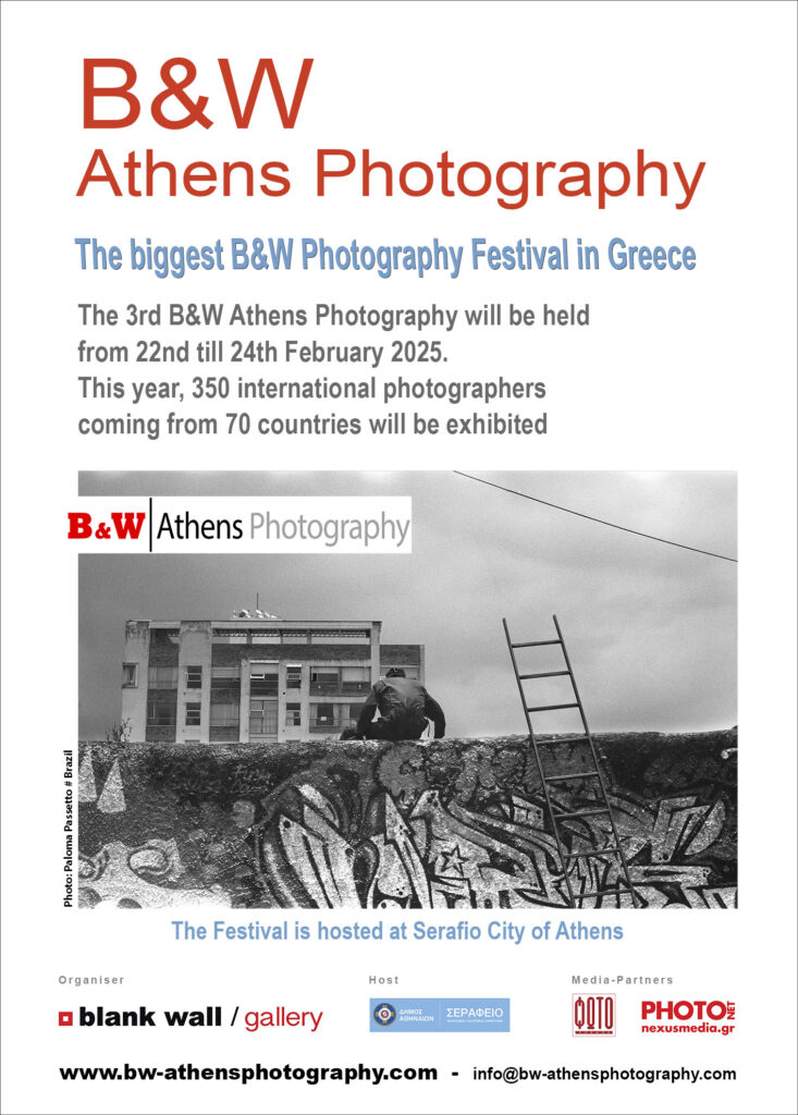I am pleased to share that my work was selected for inclusion in the 3rd B&W Athens Photography Festival, the largest black-and-white photography event in Greece. The exhibition took place from 22 to 24 February 2025 at the Serafio City of Athens, showcasing the work of 350 international photographers representing 70 countries. It was an honor to be part of such a diverse and inspiring artistic community and to present my work alongside so many talented creators from around the world.