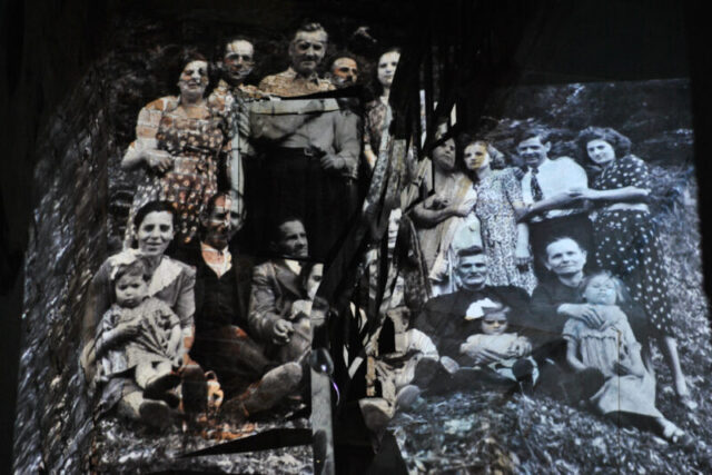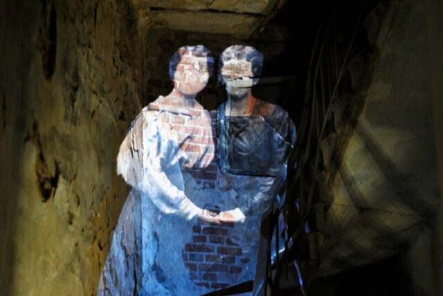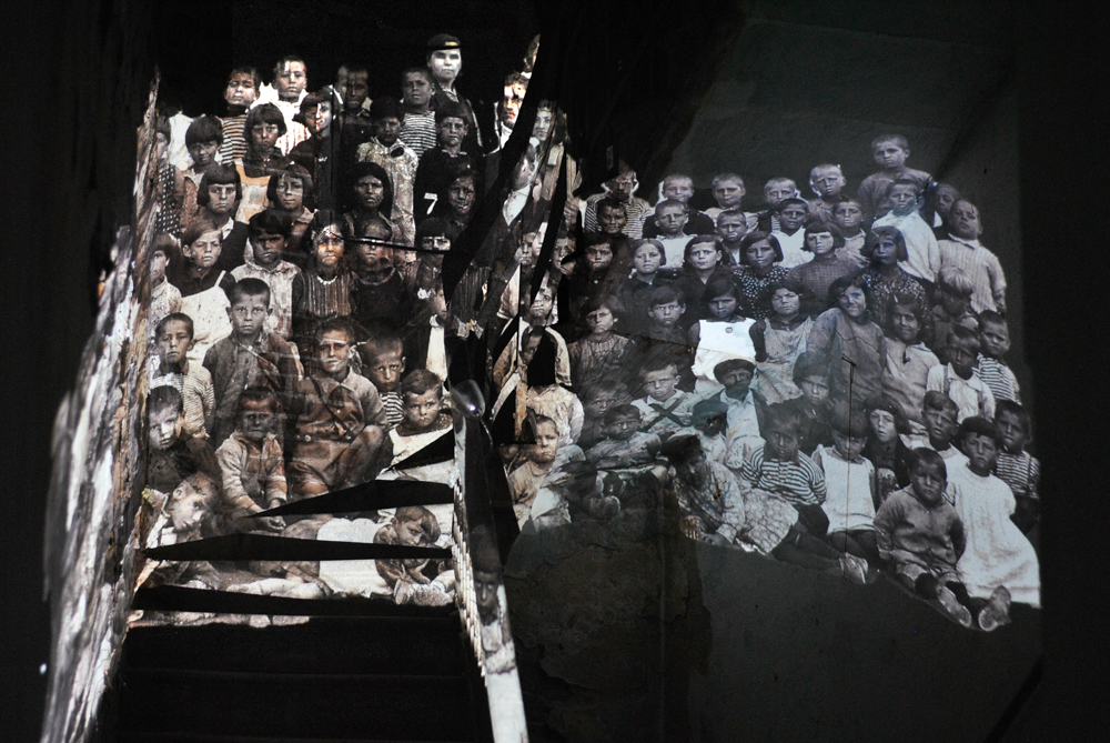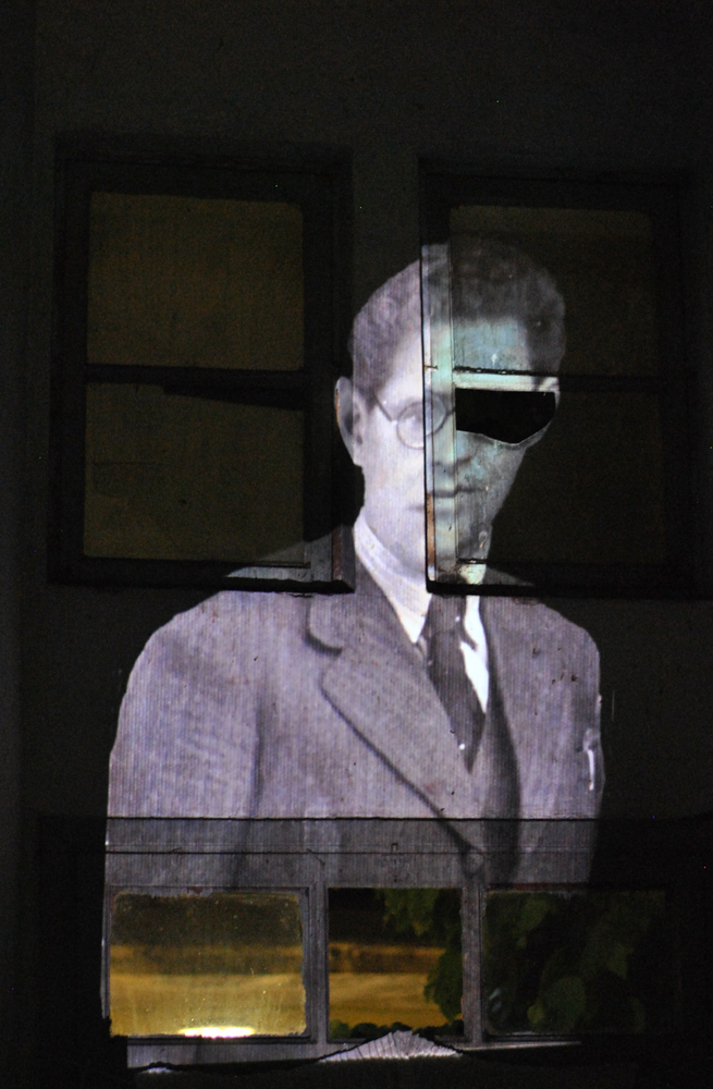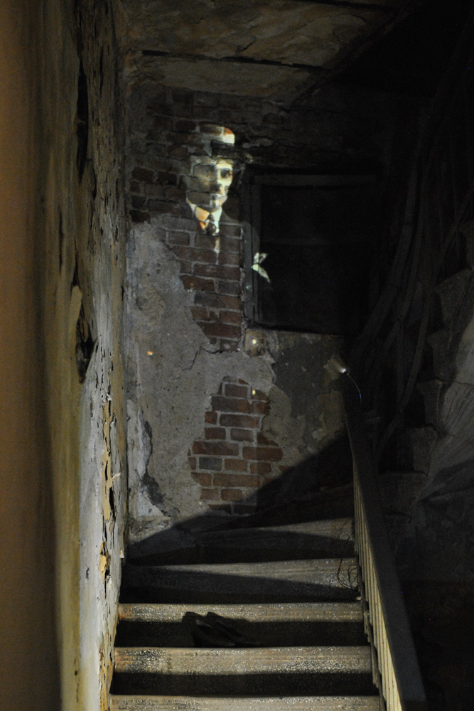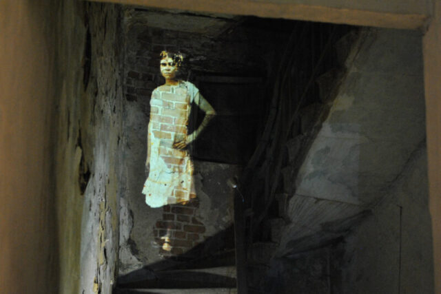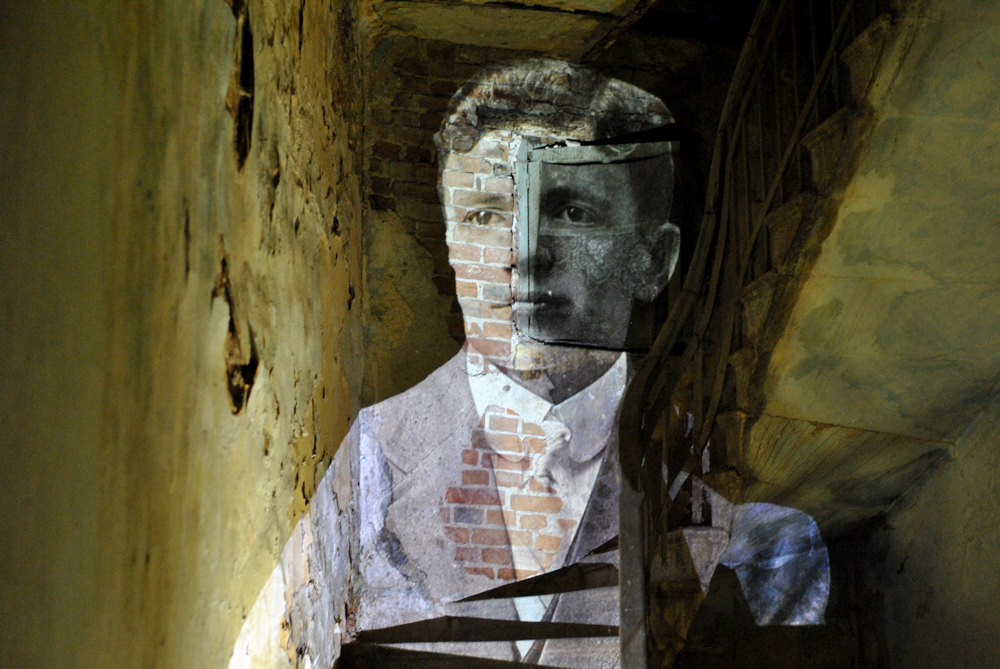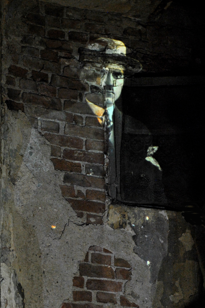 Projected inside abandoned shops and former public spaces, the archival images are transformed by the traces of time—walls, textures, staircases, and decay. These interiors actively reshape the figures, forming new narratives and what can be described as anthropo-landscapes.